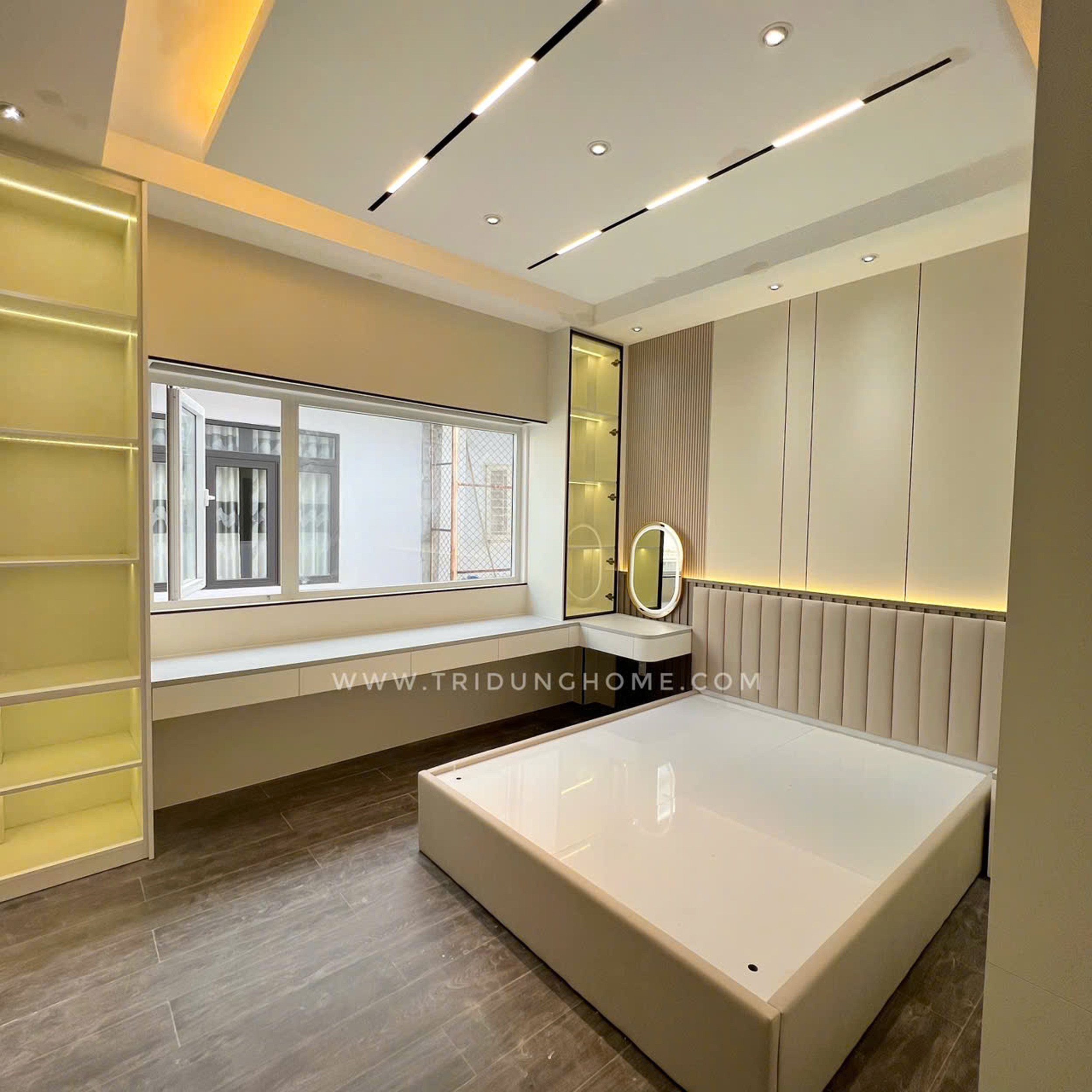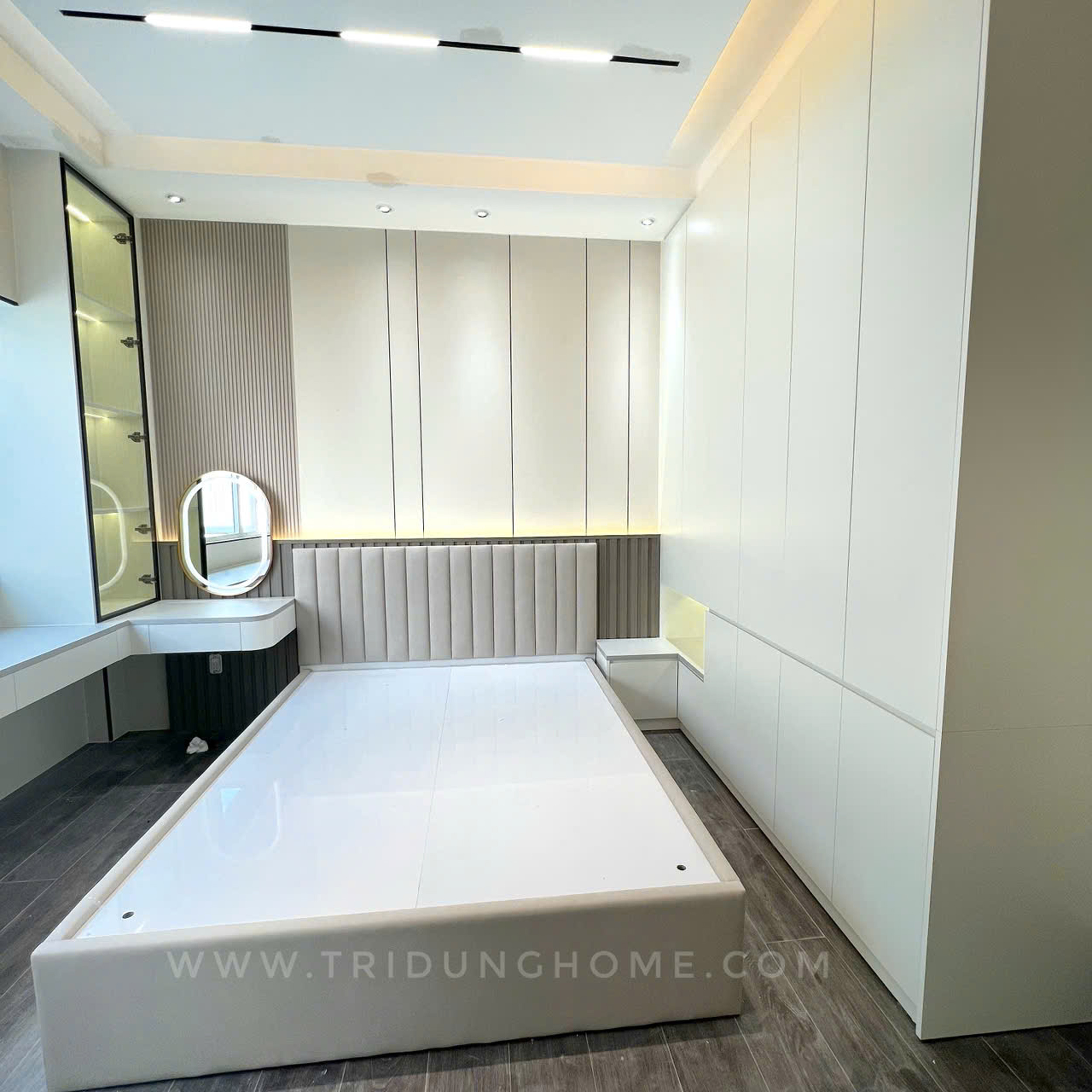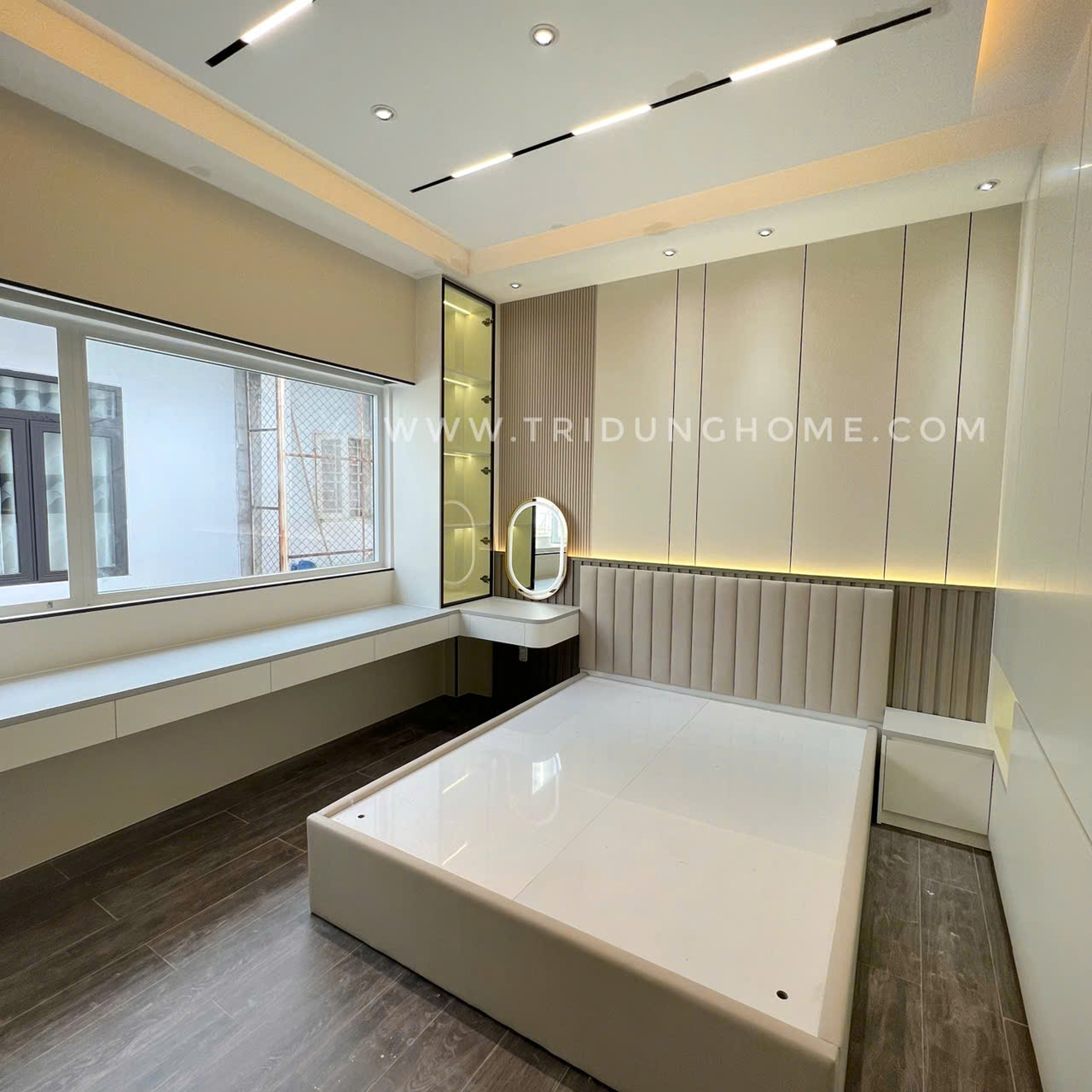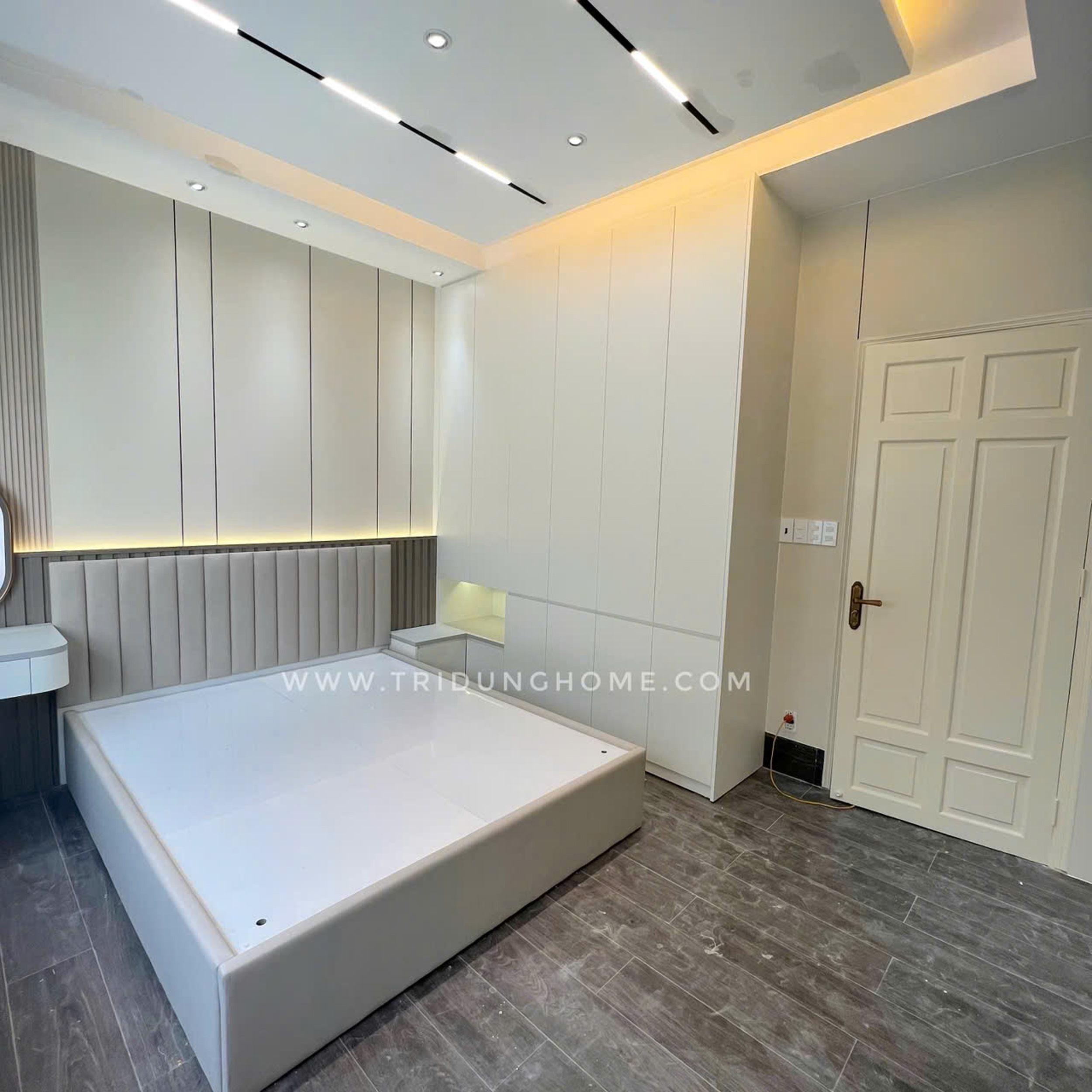 Công trình thi công tại Đường Số 24A, Bình Trị Đông B, Quận Bình Tân, TPHCM. Hạng mục thi công ốp tường bằng tấm than tre 8mm Iwood cao cấp, Thi công hệ tủ giường, bàn trang điểm.