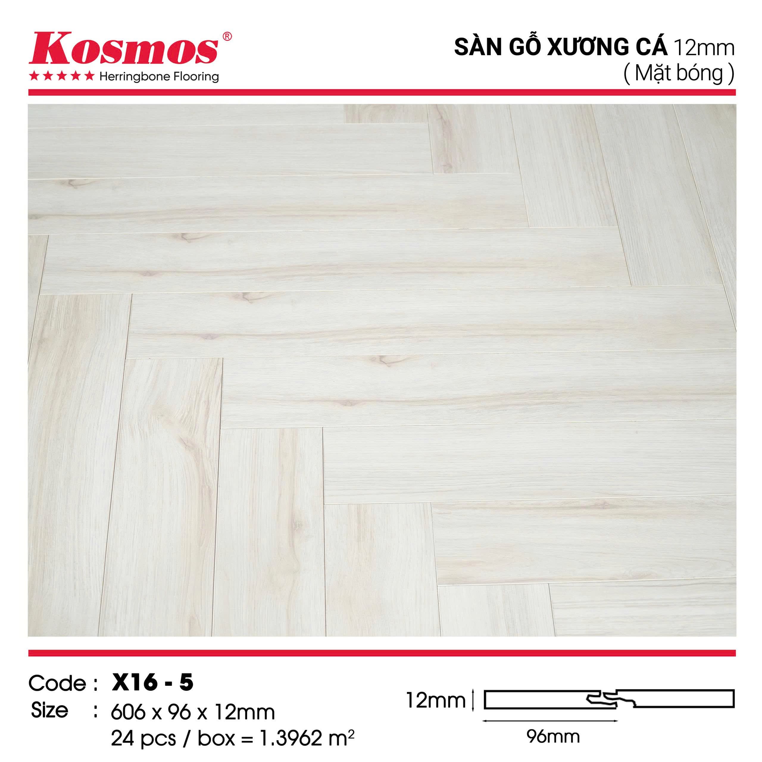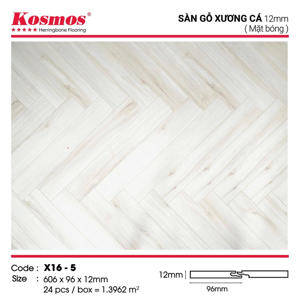 Sàn gỗ Kosmos X16-5 là dòng sàn gỗ xương cá cao cấp được sản xuất tại Việt Nam theo công nghệ hiện đại của Châu Âu.