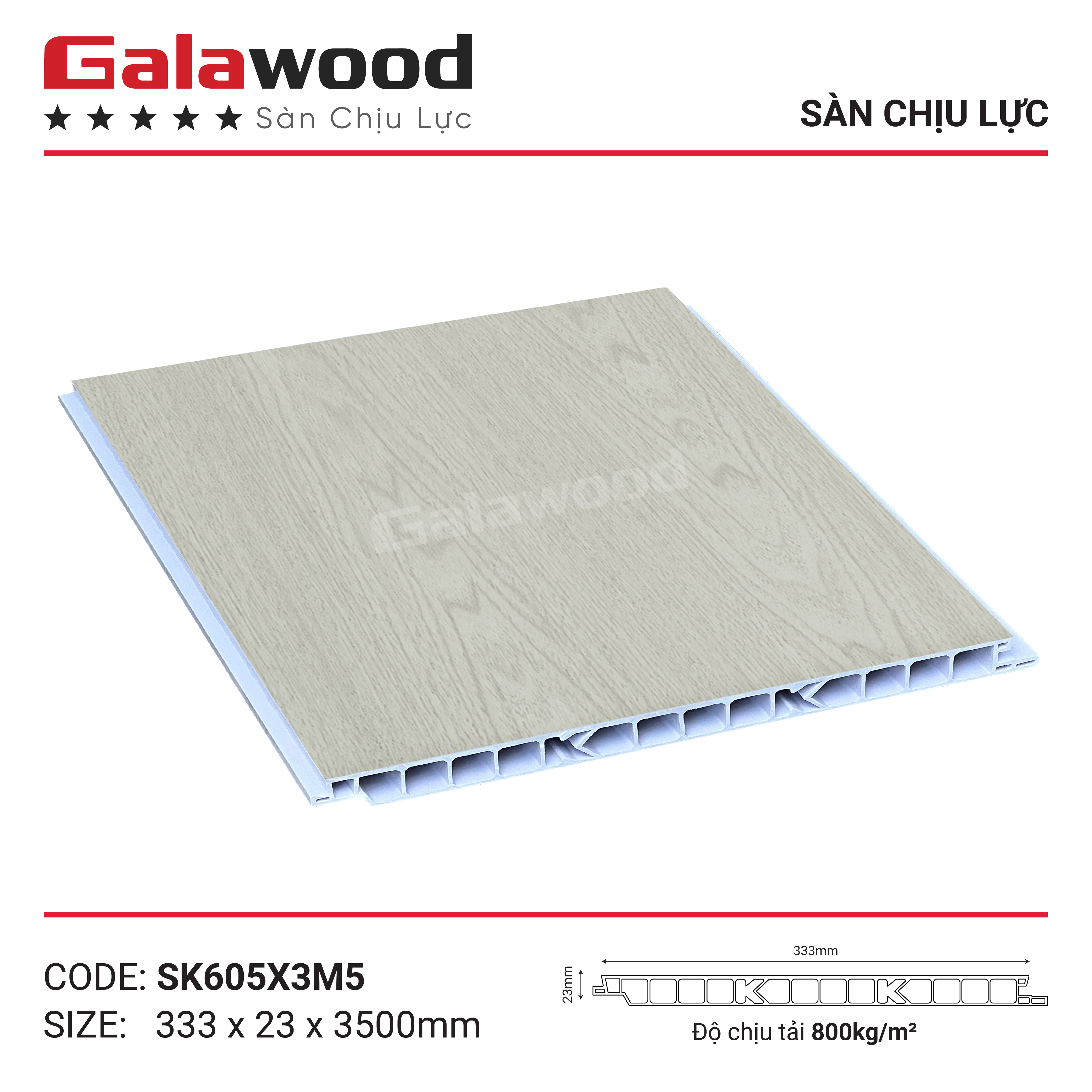 Sàn nhựa chịu lực Galawood SK605X3M/3M5/4M là là dòng ván nhựa cao cấp, chuyên dụng cho các không gian gác lửng, gác xép, sản phẩm nổi bật với khả năng chịu tải lên đến 800kg/m², mang đến sự chắc chắn, an toàn tuyệt đối cho người sử dụng – đặc biệt phù hợp với những khu vực cần chịu lực lớn.