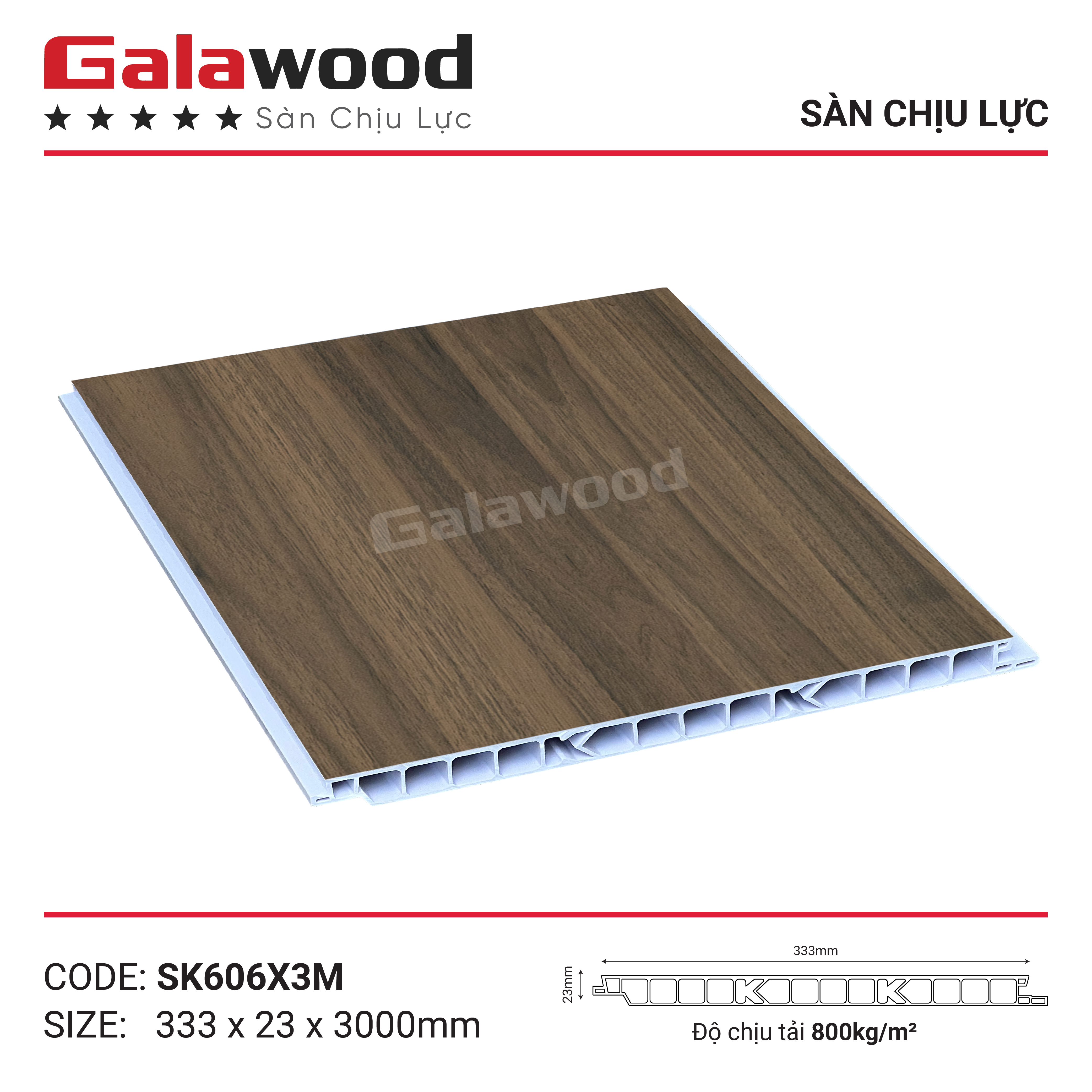 Sàn nhựa chịu lực Galawood SK606X3M/3M5/4M là là dòng ván nhựa cao cấp, chuyên dụng cho các không gian gác lửng, gác xép, sản phẩm nổi bật với khả năng chịu tải lên đến 800kg/m², mang đến sự chắc chắn, an toàn tuyệt đối cho người sử dụng – đặc biệt phù hợp với những khu vực cần chịu lực lớn.