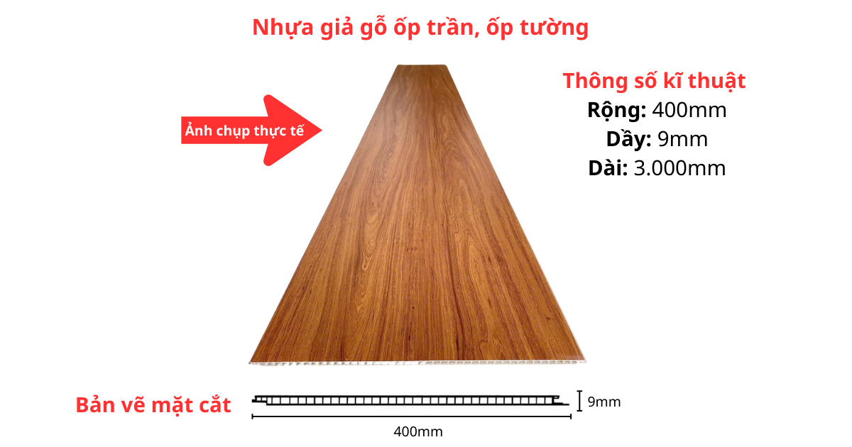Tấm nhựa giả gỗ ốp trần, ốp tường là là loại vật liệu trang trí nội thất có thành phần  26–40% hạt nhựa (PVC hoặc PS), 50–70% bột đá, cùng 4–10% phụ gia làm cốt tấm. Sau đó phủ một lớp phim vân gỗ lên bề mặt.