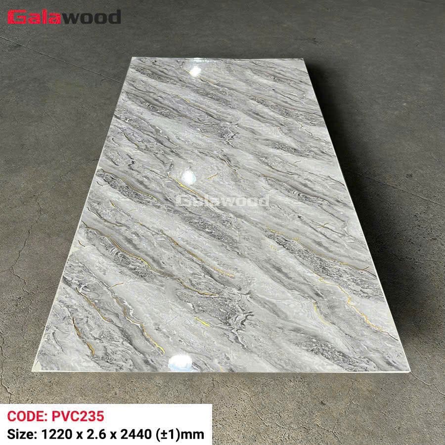 Hiệu ứng vân đá thật ấn tượng: Nhờ công nghệ in hiện đại, vân đá trên tấm PVC235 có chiều sâu và độ bóng tự nhiên như đá thật.
