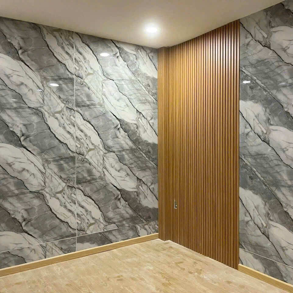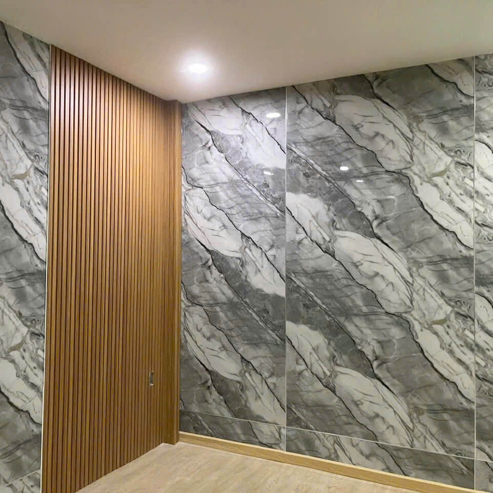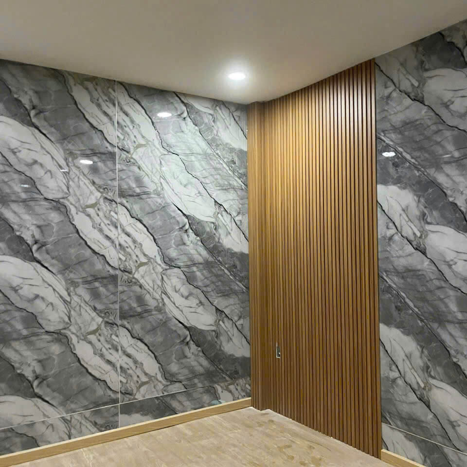 Tấm PVC vân đá cao cấp được sử dụng trong công trình có bề mặt bóng mịn, vân tự nhiên, giúp tăng độ sáng và cảm giác rộng rãi cho không gian.