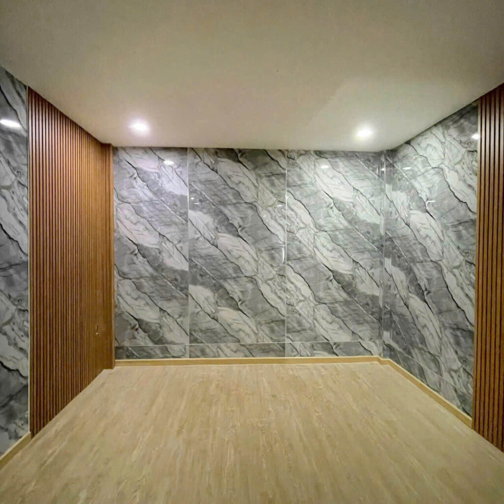 Các hạng mục ốp tường được thi công phẳng mịn, đường nối khít và cân đối – thể hiện rõ kỹ thuật cao trong từng chi tiết.