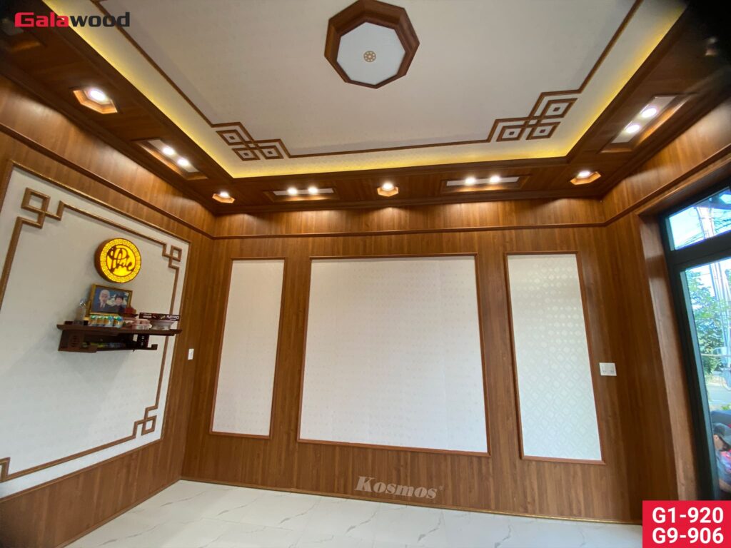 Sản phẩm sử dụng là tấm nhựa ốp tường vân gỗ cao cấp, giúp tăng tính thẩm mỹ và độ bền cho căn nhà, phù hợp với xu hướng nội thất năm 2025.