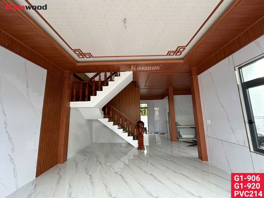 Sản phẩm sử dụng là tấm nhựa ốp tường vân gỗ cao cấp, giúp tăng tính thẩm mỹ và độ bền cho căn nhà, phù hợp với xu hướng nội thất năm 2025.
