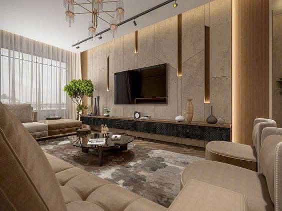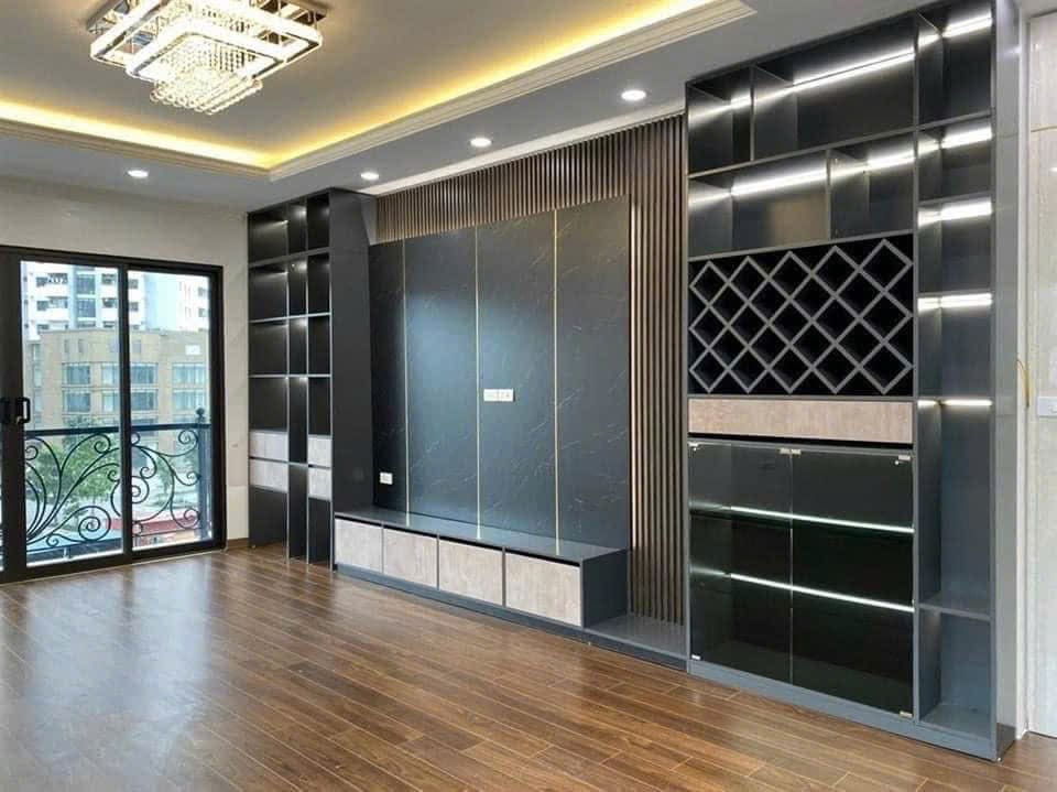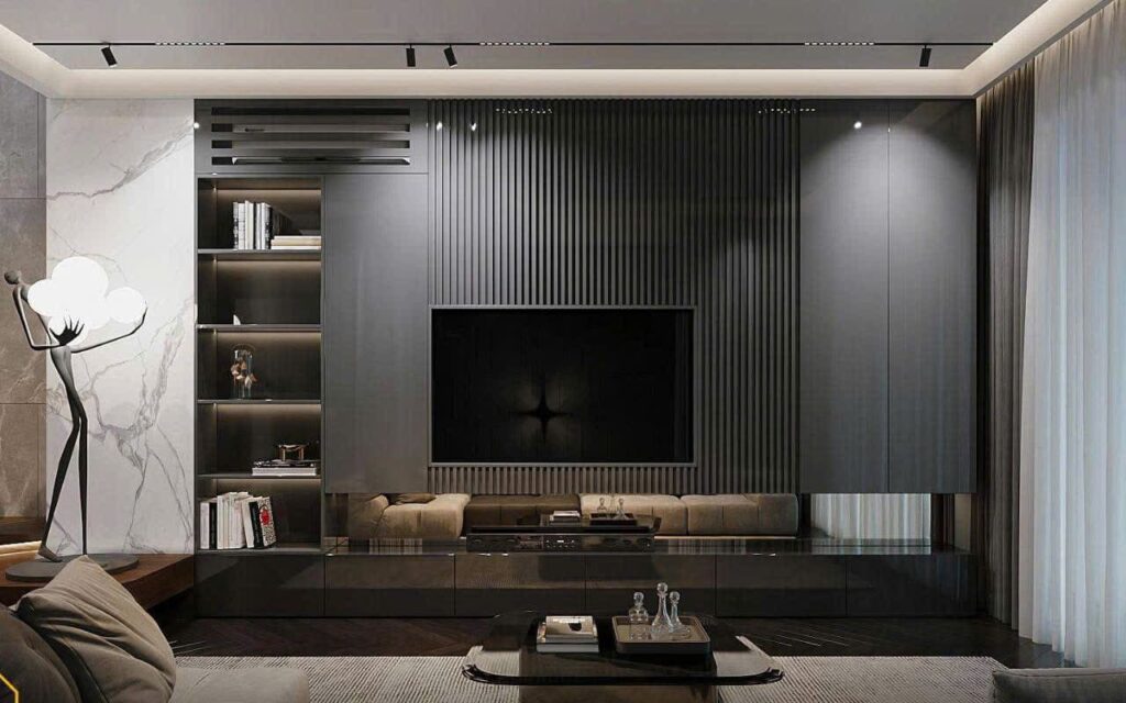 Vách tivi kết hợp tủ: Giải pháp hai trong một. Vừa trang trí, vừa tăng không gian lưu trữ cho đồ điện tử, sách hoặc vật trang trí.